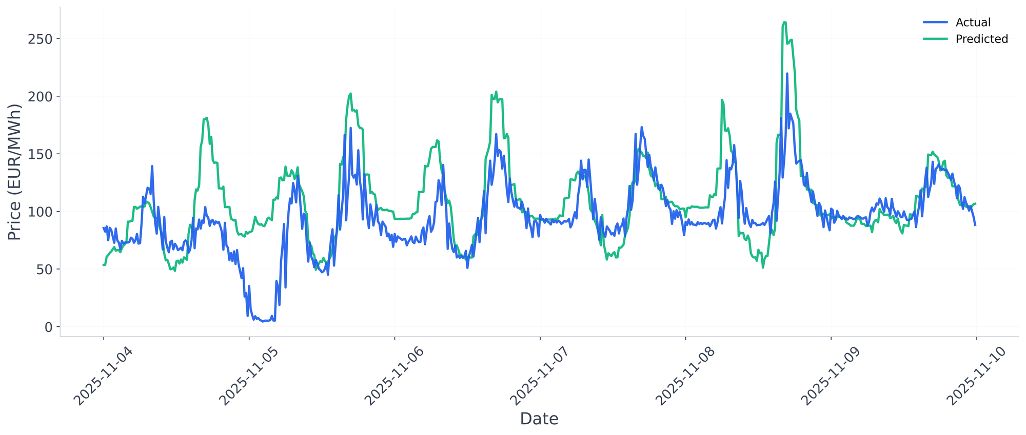 • 🌬️ Wind-driven moderation: Wind speeds reach daily averages above 10 m/s on November 15 and 16, coinciding with lower mean prices near €97–99 and widespread cloud cover above 90 %. Wind presence aligns with mild downward price pressure during those days.
