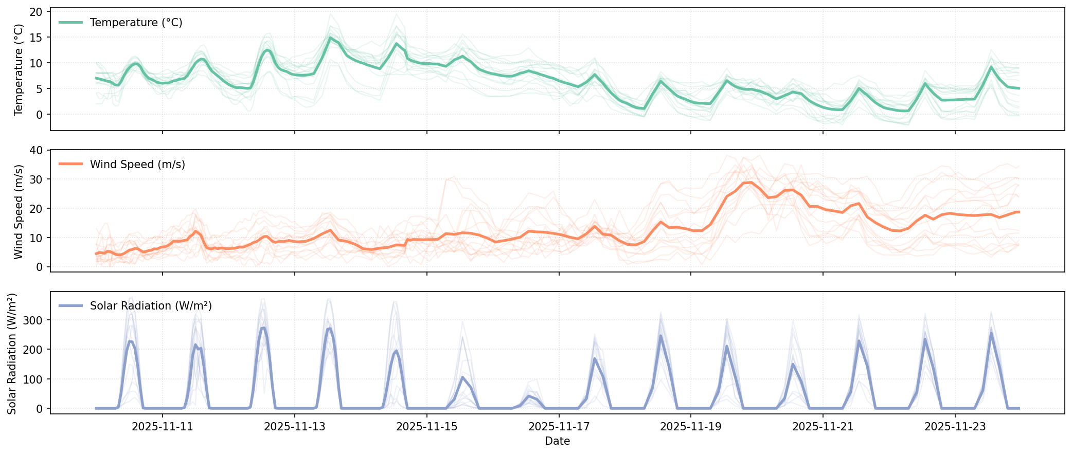 • ☀️ Solar influence: The brightest period occurs on November 12–13 with solar radiation above 60 W/m² and lower cloudiness near 60 %. Midday prices stabilize between €88 and €109, showing balanced generation effects under stronger sunlight.