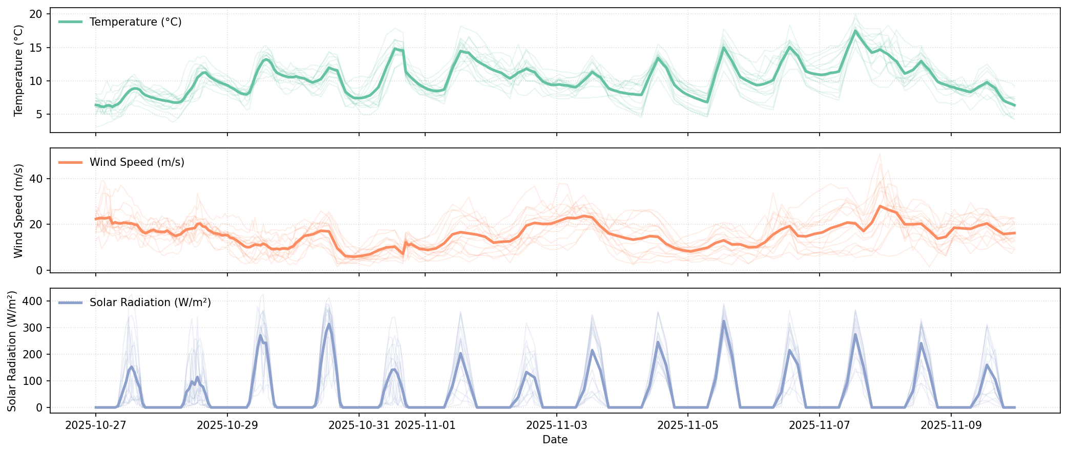 - 💨 Wind supply variability drives price inversions by day: Low-wind days (October 29–31 and November 5 at 9–11 m/s average) correlate with elevated maximum daily prices reaching €150–€164, while strong-wind days (November 3, 7–8 at 20+ m/s average) see significantly lower peak pricing at €106–€115, meaning wind variations create €30–€40 differences in daily price maxima across the forecast period, with high-wind days averaging €123 peaks versus low-wind days averaging €153 peaks.