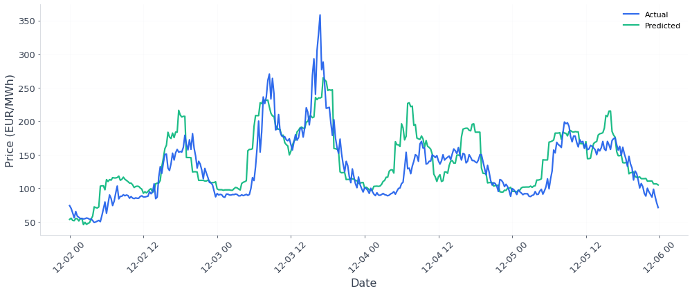 Our last week's free forecast of German day-ahead electricity prices had an overall MAE of 21.68€/MWh. Last week, we predicted: