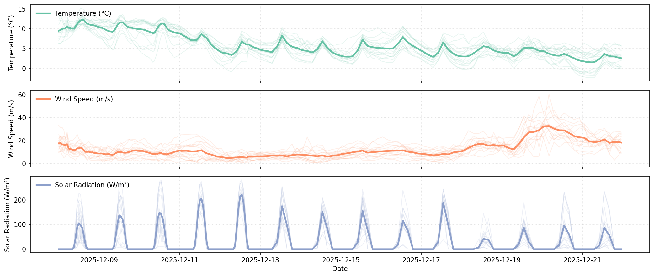 - 📉 Daily volatility and range variation: Daily price ranges vary dramatically across the forecast, from a low of €77.14 on December 13 to a high of €134.67 on December 16, with nine of thirteen days exceeding €90 in intra-day range. December 14, 16, and 21 each show ranges above €119, while December 19 and 20 experience exceptional downward pressure from sustained high wind (21.2 m/s and 28.4 m/s respectively), pushing daily means to €78.15 and €50.32.