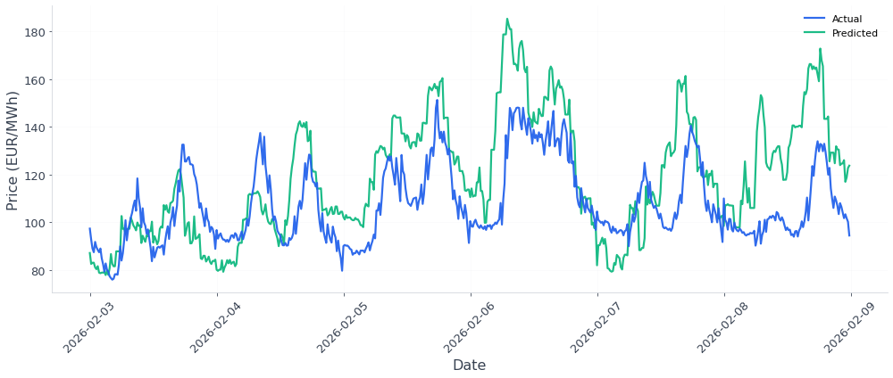Last week's forecast, we achieved a MAE of 17.18 EUR/MWh, with strong pattern predictions on the 5th and 6th.