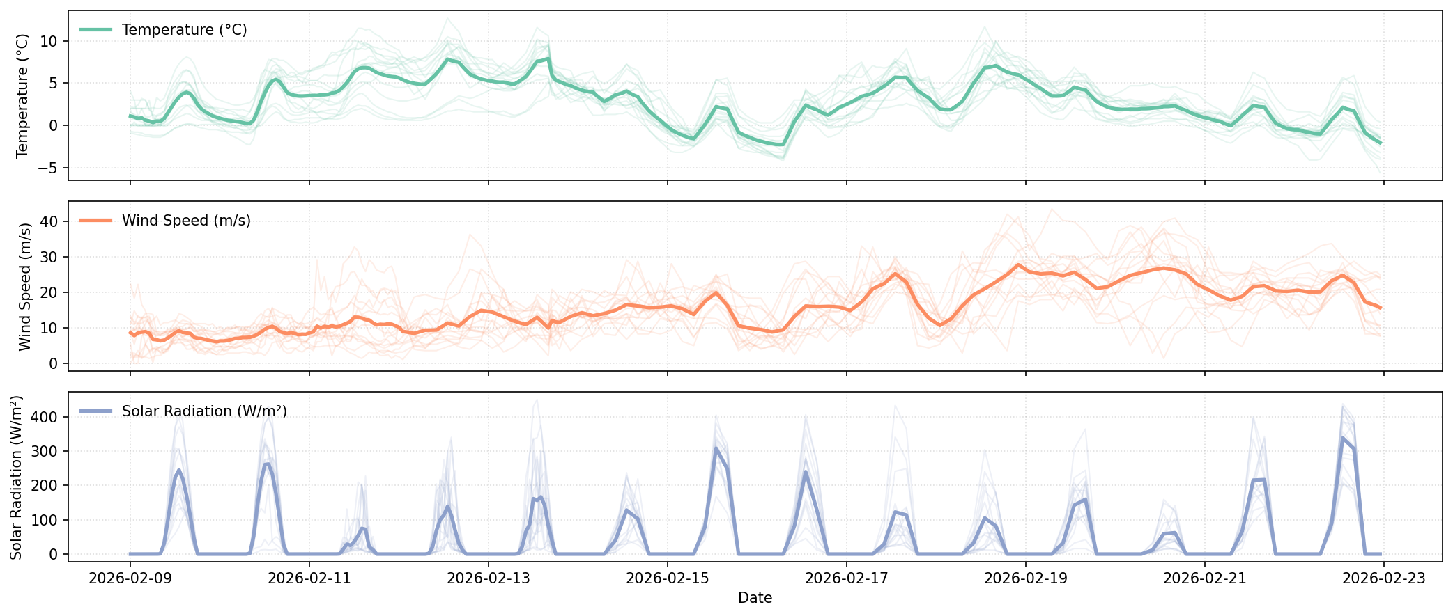 - 🌬️ Wind conditions dominate the weather backdrop, with daily mean wind speeds between roughly 7.6 m/s and 12.4 m/s, which is high relative to typical annual averages, while temperatures remain low at around 2–6 °C and solar radiation stays modest for winter, even on the brightest day at about 61 W/m².