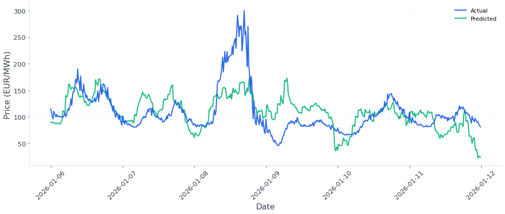 While capturing the overall price trend, our three-day-ahead forecast missed the price peak on the 8th of August, leading to an overall MAE of 26.46 EUR/MWh. We note that the elevated price forecast would have been captured better by our daily day-ahead forecast, which we do not publish on this blog.