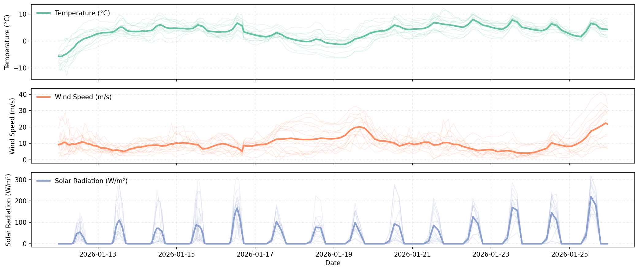 • 🌬️ Wind and weather dominance: Average wind speeds remain elevated through the week at roughly 7.5–9.5 m/s, while solar radiation stays very limited in winter with daytime peaks mostly below 50 W/m² and cloud cover frequently above 70 %, reducing solar-driven price relief.
