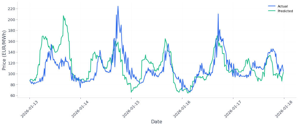 Our last week's MAE was at 19.18 EUR/MWh. While we did not capture Tuesday's price peak shape, our forecast throughout the week followed the actual pattern well.