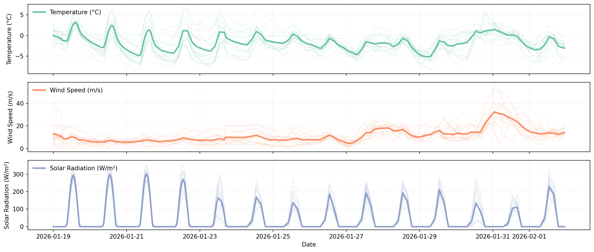 - ⚡ Standout price event: Monday January 26 emerges as the week's most volatile day with prices reaching €265 at 17:15, driven by 90% cloud cover limiting solar output to 41 W/m² average while temperatures sit at -2.2°C, pushing heating demand and creating a €163 daily swing from €103 to €265.
