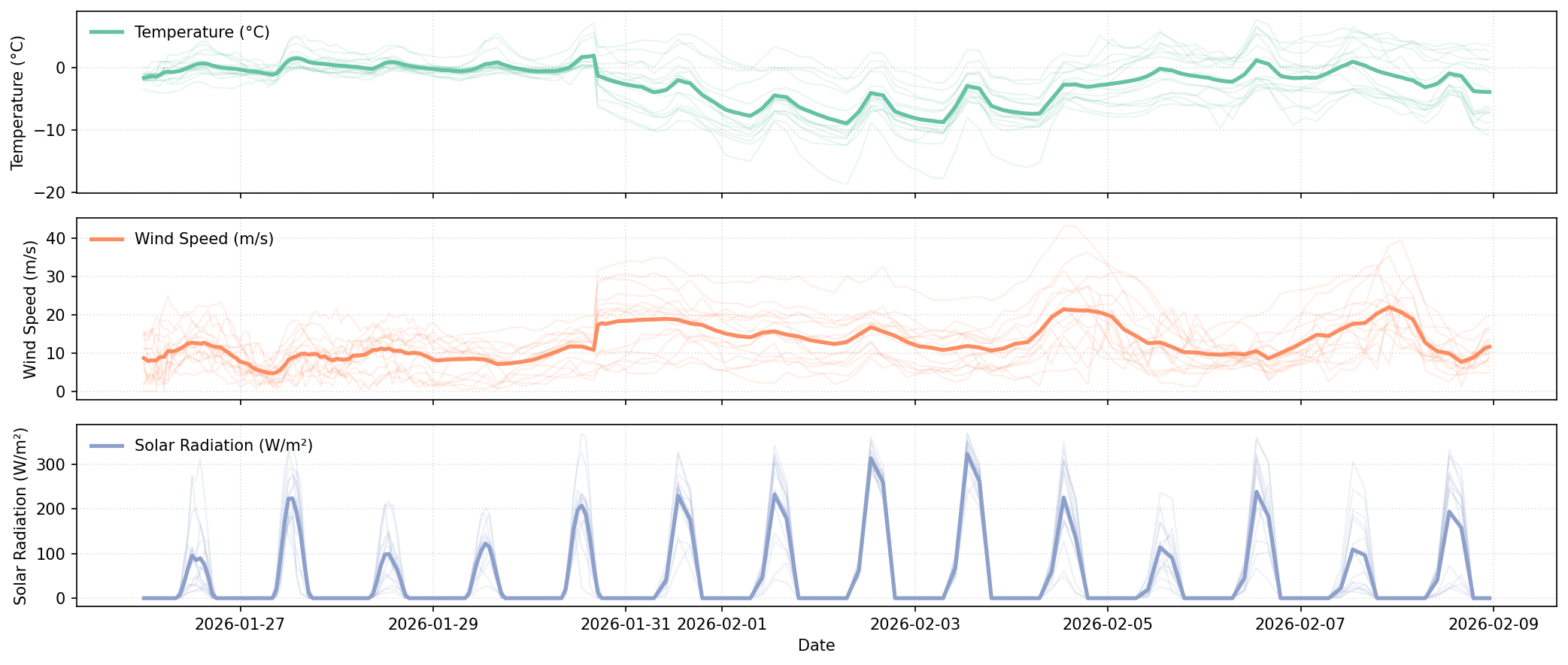 • 💶 Price range comparison: The full forecast spans €44.28 to €182.19 at HH:00, and daily HH:00 ranges vary materially, from a tighter €63.11–€126.80 on Jan 31 to a broader €74.09–€182.19 on Feb 5, while solar radiation averages remain winter-moderate at roughly ~21–56 W/m² per day even on the brighter days.