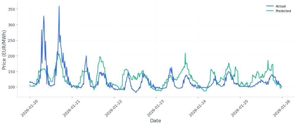 Our last week's MAE was at 21.50 EUR/MWh. As we announced in the title of last week's article, we were seeing prices above 200€/MWh. However, we underestimated the actual peak prices on the 20th of January (but predicted the right shape of the price).