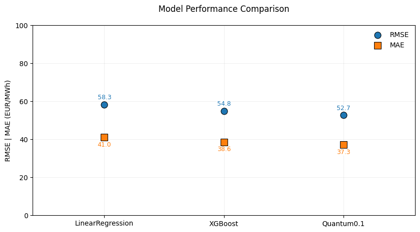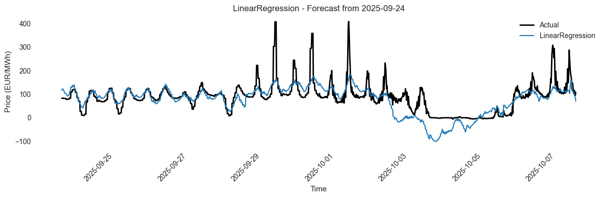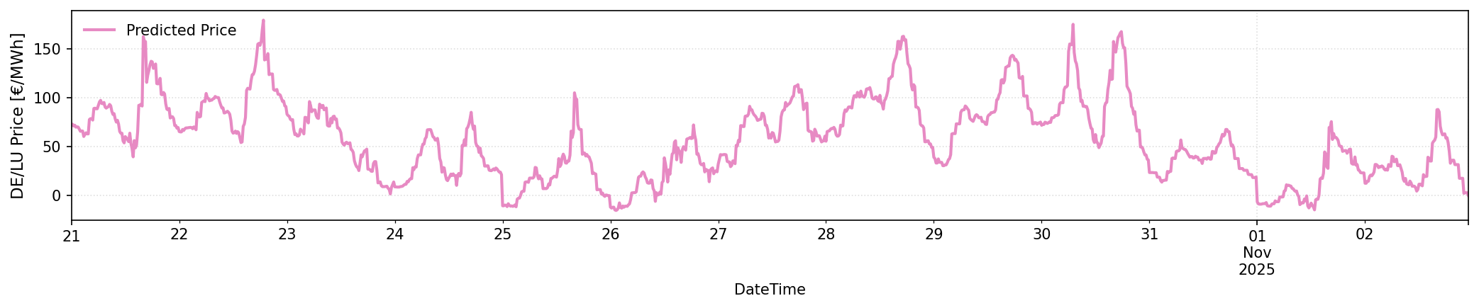 Accordingly, our model outperforms all benchmarked models (see below) in terms of RMSE and MAE . The MAE of 37.3 can be interpreted as: on average, our model has an error of 37.3€ when forecasting quarter-hourly day-ahead market prices on a two-week horizon. This might sound high, but it is primarily guided by recent price spikes in the 400€ region. We have also benchmarked the model in initial experiments against state-of-the-art Transformer models, which had significantly higher computational costs but worse results (even than the Linear Regression), so we resort here to well-performing tabular methods.