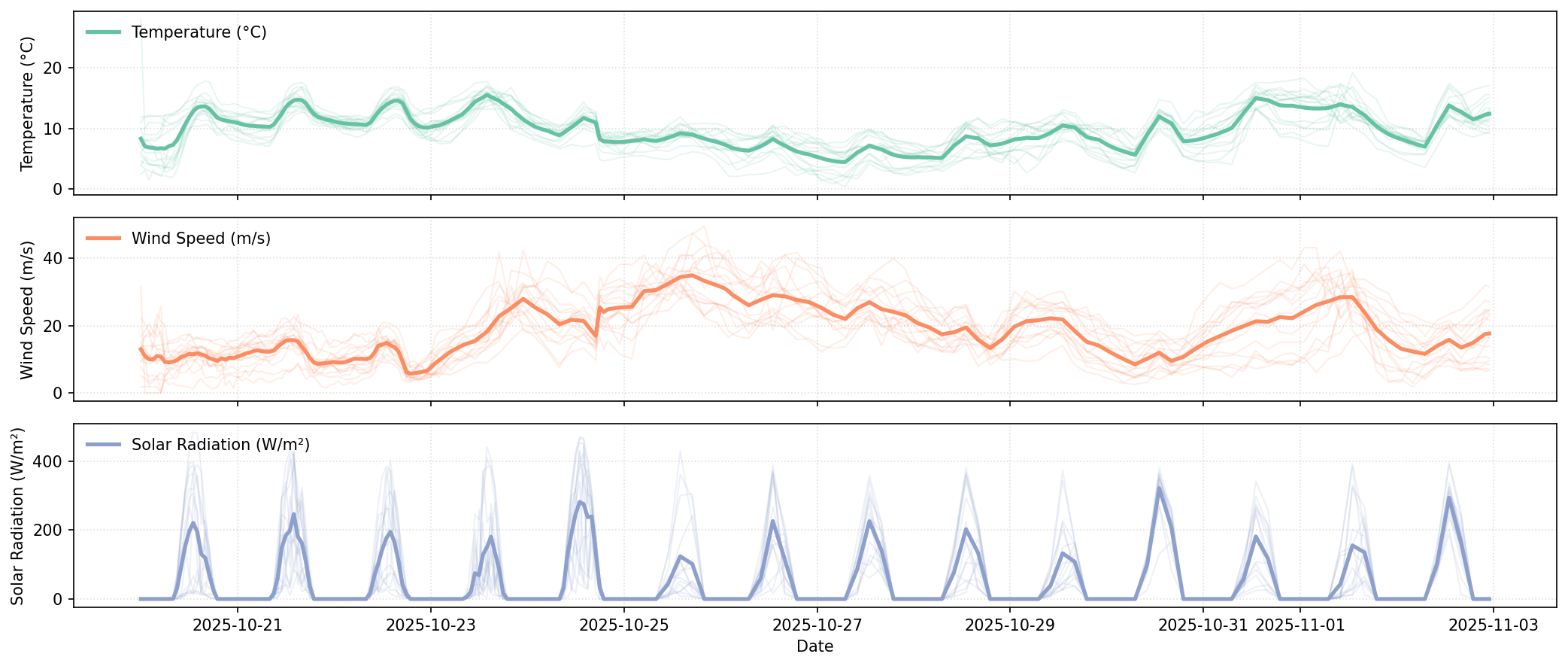 We benchmark our model against a standard linear regression and XGB Boost model. We evaluate in terms of the typical metrics RMSE and MAE [6]. The benchmarking is conducted based on 15 14-day-ahead forecasts, such as illustrated below with data from the 19th of September to the 2nd of October 2025.
